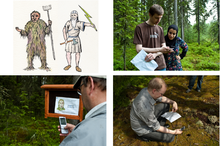 The game has storytelling elements and various task types through which the visitor is able to be immersed in the learning experience. Characters are borrowed from the Finnish national epic story, Kalevala. In the game the player adventures through various Magic Spots each having a specific theme such as beginning of life, afterlife, energy, animals and time. Ukko, the high god in Kalevala, is helping the player by training him/her for the battle against Hiisi, the evil and malicious spirit that seeks to destroy the connection between the man and the nature. Following figures illustrate concept art of Ukko and Hiisi as well as a photographs from the first game session.