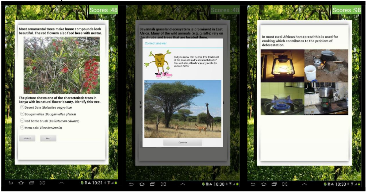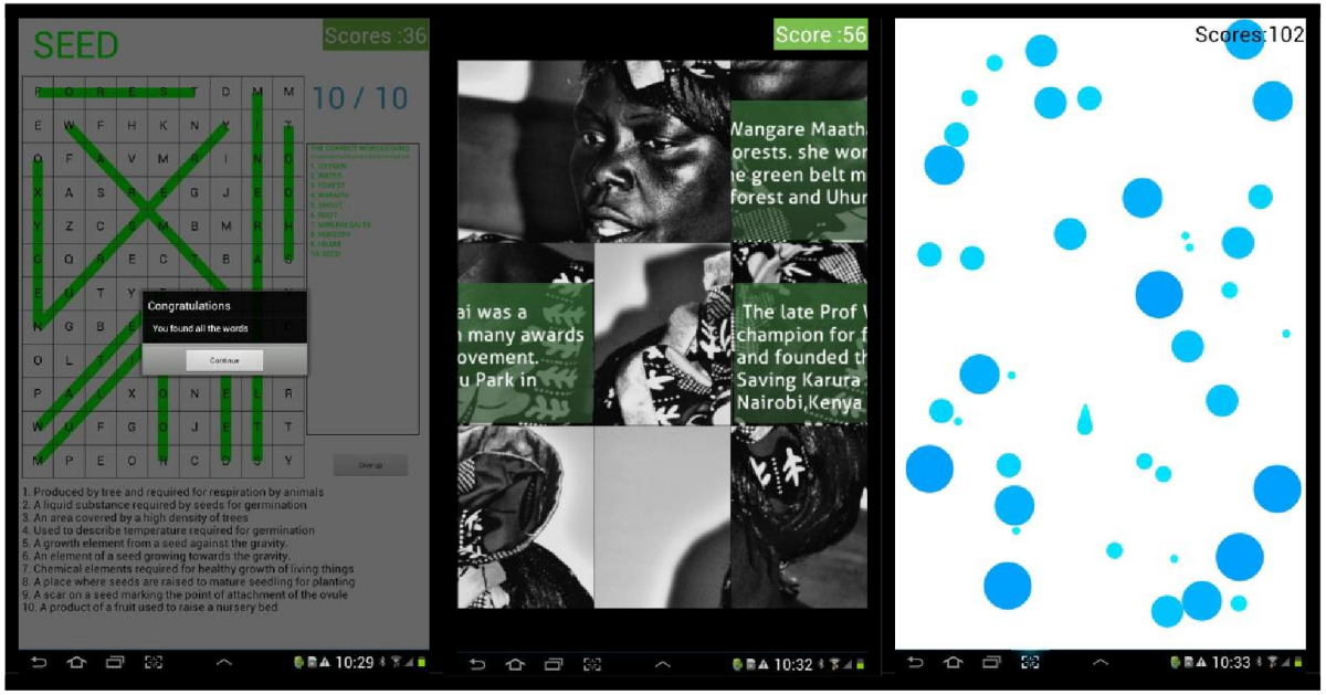In the game, the player is guided by the Ent character through various forestry related topics such as managing a tree nursery, uses of different trees and the importance of forests for sustaining life. The player must solve various quizzes releated to forests in order to proceed in the game. The quizzes have relevance to the surrounding forest at the University of Eldoret. EntVenture also consists of three embedded minigames – a word search, picture puzzle and a balancing game. The foundations and the concept of embedding entertaining minigames into a pedagogical story were adopted from the Bagamoyo Caravan game. Figures below illustrate quizzes and minigames in EntVenture. You can download the game from Google Play.