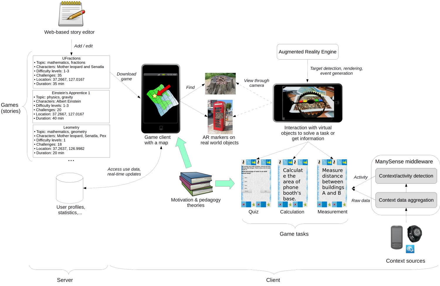 Purpose: Provide educators and learners an easy way to create, deploy and share context-aware learning games that leverage the power of augmented reality and the ManySense middleware.