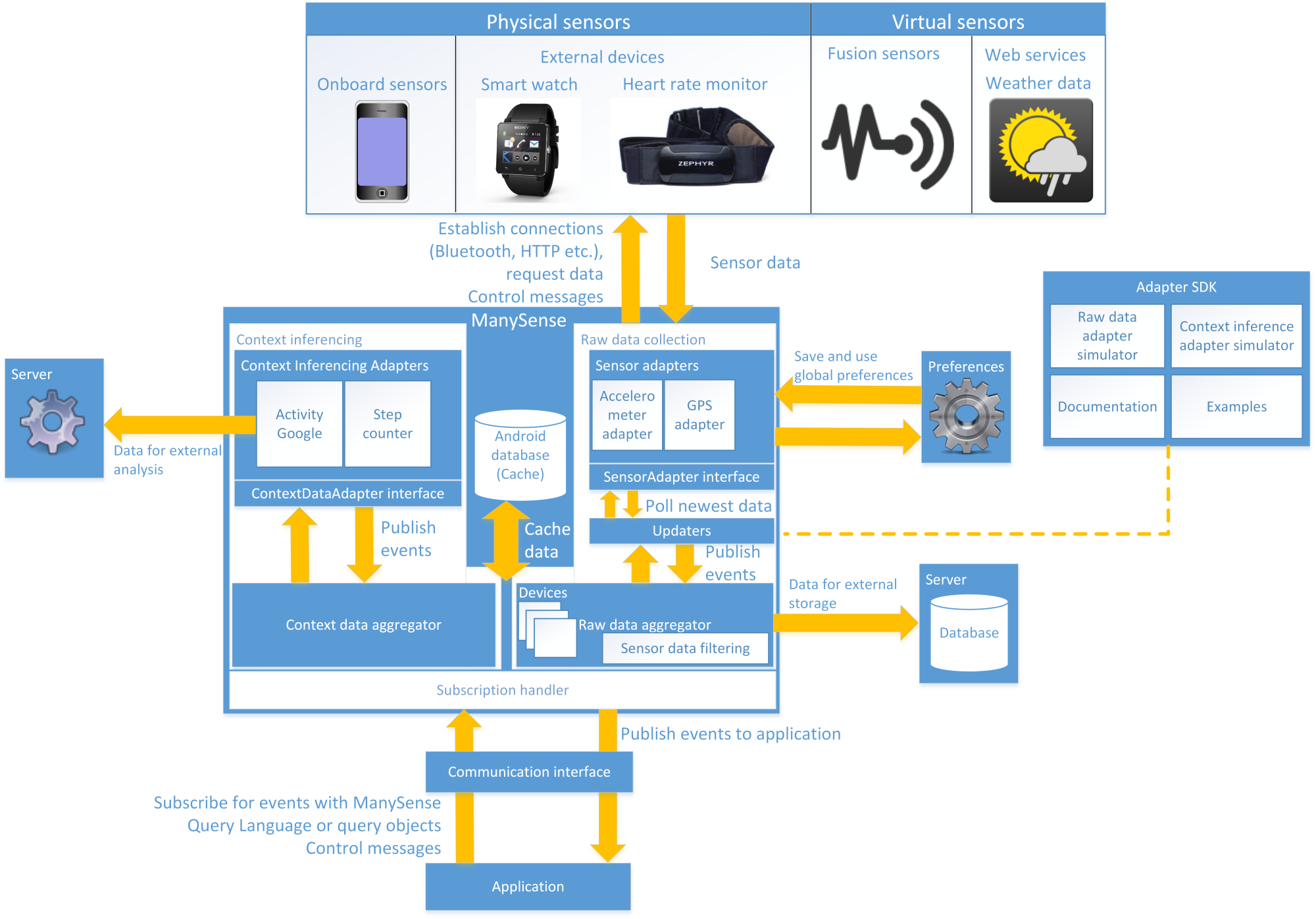 So how exactly does ManySense manage a myriad of heterogeneous sensor devices and other context sources? Figure 1 explains the architecture of ManySense. The aggregators (Raw Data Aggregator and Context Data Aggregator) gather data from sensors and context inferencing algorithms, and distribute them to third-party subscriber applications. The Raw Data Aggregator (RDA) communicates with different sensors through sensor adapters. There exists one adapter per each supported sensor and each adapter holds specific functionality for acquiring data from a specific sensor. Sensor devices are not limited to one protocol because the adapters handle communication with the sensor devices using required protocol such as Bluetooth or HTTP. For example, in addition to Bluetooth-based sensor adapters we could create a sensor adapter for acquiring data from a sensor web using HTTP. When sensor adapters receive updates they publish sensor events to the RDA which, in turn, forwards the data to the subscribers which are subscribed to that sensor’s data. Sensor adapters offer a common interface for the RDA. This way the individual adapter implementations are hidden and the aggregator does not need to be concerned by them. It is also easy to add new sensor adapters, thus improving extensibility.