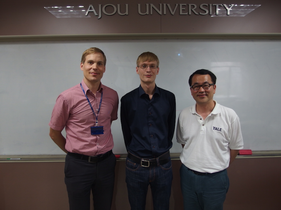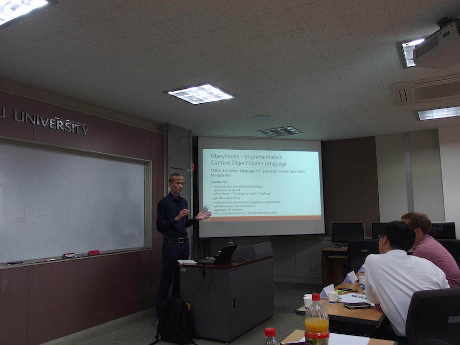 On May 14, Joonas Westlin successfully defended his MSc thesis “Middleware system for facilitating context-aware application development on smartphones”, which is essentially an account of research and development work done on the ManySense middleware. The defense committee consisted of Prof. Teemu Laine (Ajou University), Prof. Seok-Won Lee (Ajou University), and Prof. Adil Khan (Innopolis University, Russia). Joonas will be the first student to graduate from UbiLife lab. His contribution to UbiLife’s research with Calory Battle and ManySense has been indispensible. Congratulations for a job well done, and best wishes for the future!